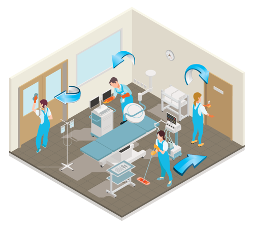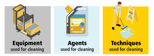 There are three important factors that work together to help ensure high cleaning standards in a hospital or other healthcare facility and prevent the spread of infectious diseases. These are the agents used for cleaning, the equipment used for cleaning, and the techniques used for cleaning.