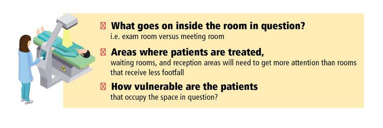 To begin, it's helpful to identify which surfaces and areas are most at risk of transmitting illnesses and bacteria between patients, staff, and others. Ask yourself the following questions to begin sorting different items and areas into high- and low-priority categories: