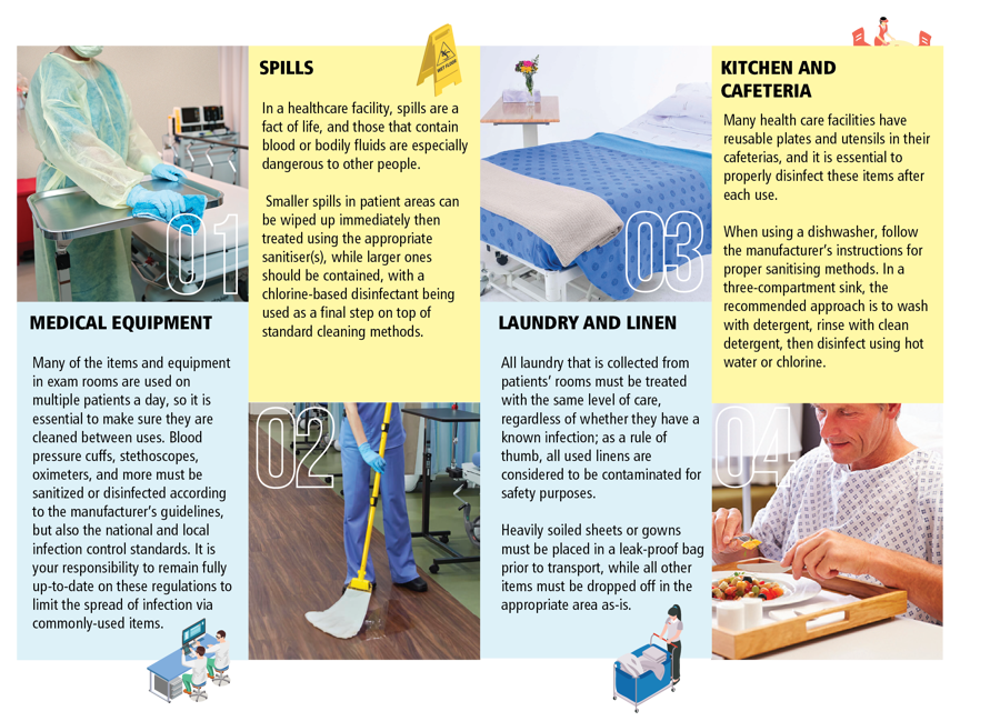 Maintaining a clean and hygienic environment is an effort that must be tackled from all angles. From patient-facing equipment to the main cafeteria, it's important to be aware of the factors and activities that require specific attention.