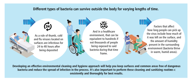 Developing an effective environmental cleaning and hygiene approach will help you keep surfaces and common areas free of dangerous bacteria and reduce the spread of infection in the process. It's also important to perform these cleaning and sanitizing routines consistently and thoroughly for best results.