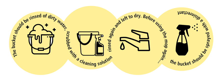 Infrequent water changes can be a major problem, contributing to the spread of HAIs and similar ailments. In hospitals, mop buckets should be cleaned daily, if not more frequently. The bucket should be rinsed of dirty water, scrubbed with a cleaning solution, rinsed again and left to dry. Before using the mop again, the bucket should be sprayed with a disinfectant before being filled with a fresh cleaning solution.